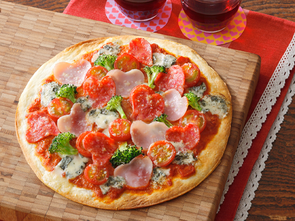 ピザ生地に1を塗り、ミニトマト、ブロッコリー、ビアサラミ、ハムをのせ、ゴルゴンゾーラチーズを散らし、粉チーズをかけトースターで10分程焼く。