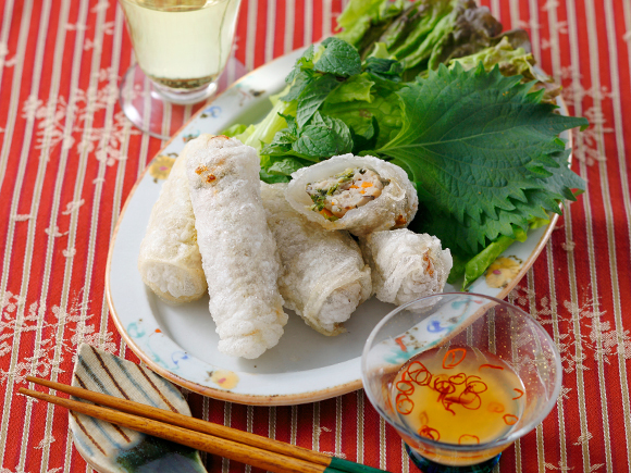 鶏ひき肉、にんじん、しいたけを炒め、ナンプラーで味付けした具材で春巻きを揚げ、サニーレタス、しそ、ミントでさらに巻いて、さっぱりタレでいただきます。
