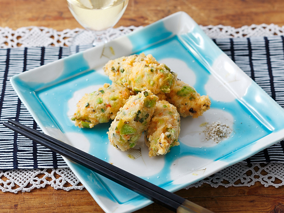 海老を刻み、そら豆、小ネギ、マヨネーズ、片栗粉で生地を作り、丸い形にして揚げ焼きします。マヨネーズの酸味とこってり感がシンプルな和食にコクを出すポイント。山椒塩を添えれば、ワインが止まらないおいしさに!
