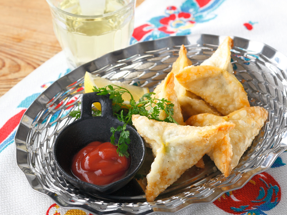 ワインがすすむエスニックテイストのスピードメニュー。マッシュポテト、クリームチーズ、枝豆、黒オリーブ、クミン、カレー粉、バターを混ぜ合わせ、餃子の皮で包んで揚げます。具は火が通っているので、軽い揚げ焼きでOK。
