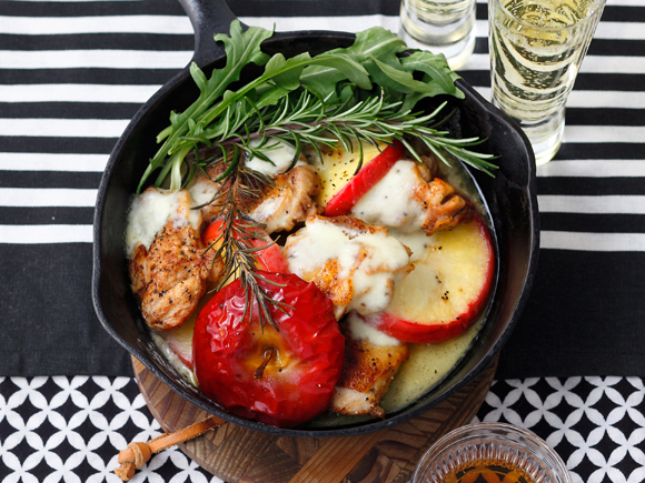 ジンジャーパウダー、シナモンパウダー、塩、黒コショウを振り、両面をしっかり焼いた鶏もも肉とバターでソテーしたリンゴを合わせ、モッツァレラチーズ、ローズマリー、バターをのせてオーブンで20分焼きます。メープルシロップをかけていただきます。