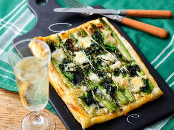 市販のパイシートに、サワークリーム・おろしニンニク・マヨネーズを合わせたソースを塗り、ナッツを散らします。その上にアスパラガス、菜の花、ルッコラを並べ、モッツァレラを散らして黒コショウをかけ、オーブンで約20分焼きます。