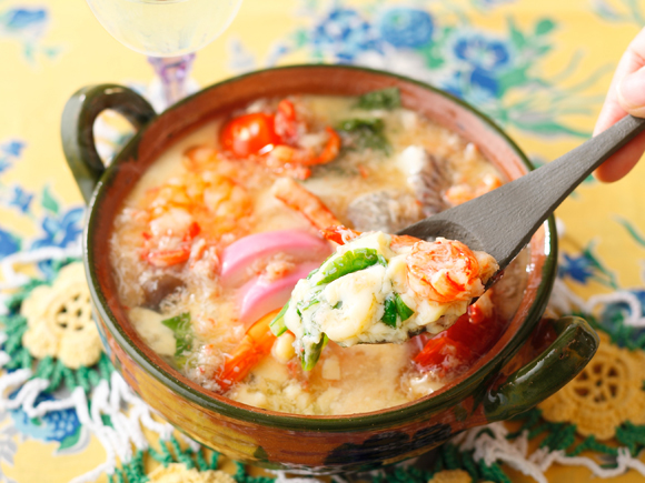 大きめの鉢に鯛の切り身、えび、しめじ、かまぼこ、ミニトマト、小松菜を入れ、茶碗蒸しをつくります。次にカニ、白ワイン、鶏がらスープ、醤油、みりんでつくったあんを茶碗蒸しにかけて完成です。冷やしてもおいしくいただけます。
