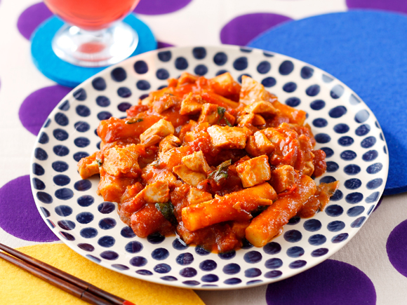 ホールトマト、玉ねぎのみじん切り、コチュジャン、ニンニク、ショウガ、白すりごま、砂糖ベースの韓国風ソースに、マグロ、トッポギを入れて、2分ほど火にかけます。ミントを和えて完成です。