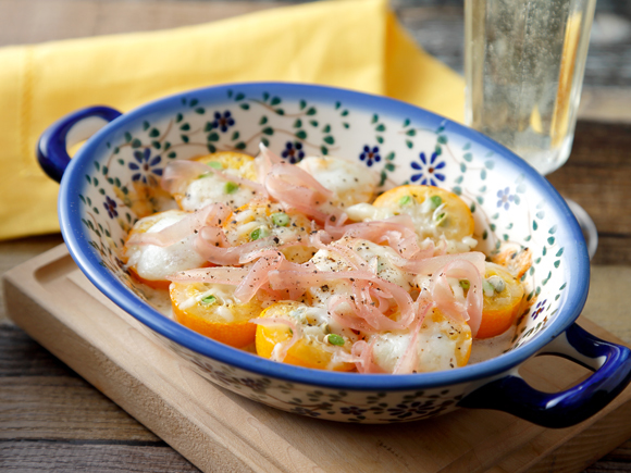 金柑を半分にカットして、チーズをのせて焼くだけの簡単レシピ。ピザ用チーズ、モッツァレラチーズをのせた金柑をトースターで焼き、生ハム、黒コショウを散らしていただきます。