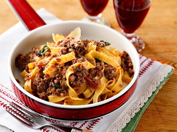 薄切り牛肉を粗くカットし、バジル、アーモンド、ケッパー、ニンニクみじん切りとともにホールトマトで軽く煮込みます。濃厚なソースによく絡むタリアテッレ(平打ち麺)と和え、粉チーズをかけていただきます。