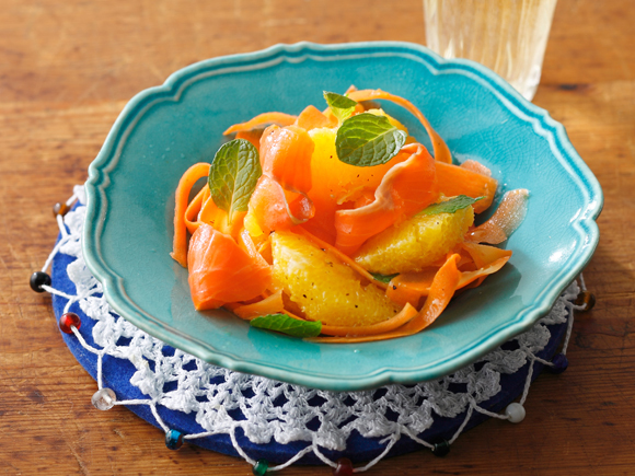 ピーラーを使ってリボン状にしたにんじん、オレンジ、スモークサーモン、ミントを器にのせ、マーマレード、酢、オリーブオイル、塩、コショウを混ぜたドレッシングをかけて軽く和えます。にんじんがすべての風味を吸収して旨み出しに一役買ってます!