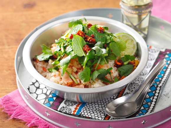 ごはんと焼豚、パプリカ、ピーナッツ、桜えびを炒め、ナンプラー、ライム汁で味付けします。パクチー、クレソンをたっぷりのせ、食べるラー油をかけて出来上がりです。全体をしっかり混ぜてもおいしくいただけます。