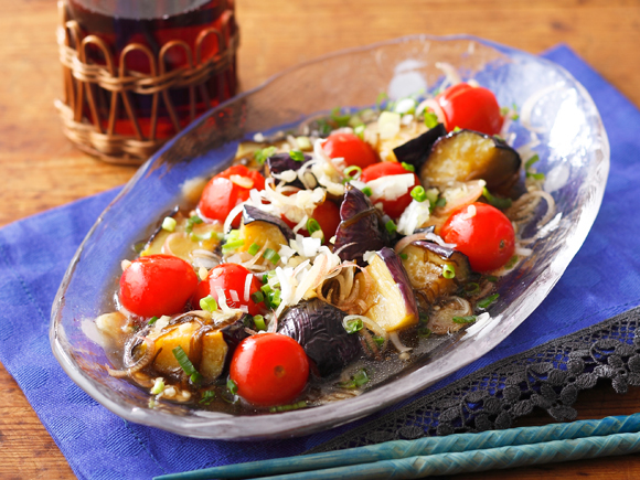 表面にサラダ油を塗り、電子レンジにかけて仕上げた揚げナス、軽く切れ目を入れたミニトマトをもずく酢、ポン酢、ごま油のマリネ液に浸け、味をなじませます。ミョウガ、ネギのみじん切りをのせて完成です。