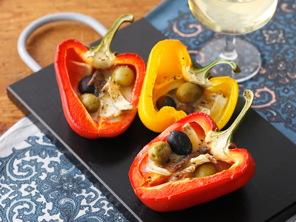 パプリカ(黄・赤)を2つに割り、中にブリーチーズ、アンチョビ、オリーブ、ニンニクなどを詰め、トースターで焼きます。たっぷりのオリーブオイル、岩塩をかけていただきます。