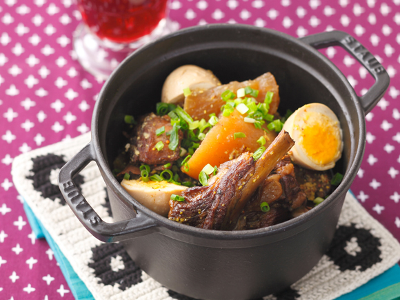 大ぶりのスペアリブ、大根を砂糖、醤油、みりん、バルサミコ酢、粒マスタードで煮込み、途中でゆで卵を加えます。普通の鍋で約1時間、圧力鍋なら20分で、ホロホロとろけるように柔らかいお肉の煮物が完成します。