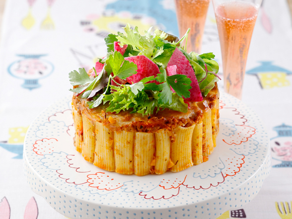 ちょっと手間はかかるけど注目度は満点! 筒状のショートパスタをミートソースで和え、ケーキ用型に敷き詰め、ピザ用チーズをのせてオーブンで焼きます。型から外し、色とりどりの野菜を山盛りにのせ、レモン・ハチミツベースのドレッシングをかけて完成です。