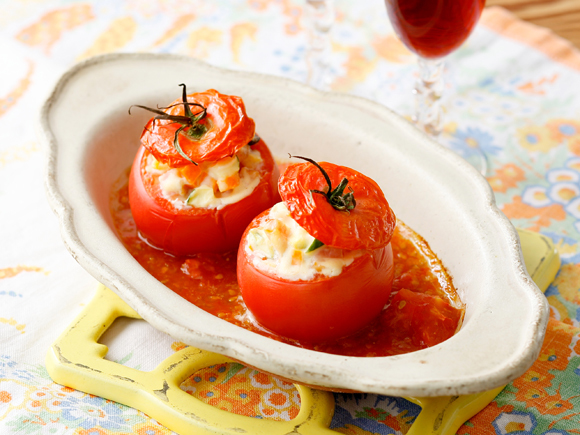 トマトを丸ごと使った、焼き色が食欲をそそるレシピ。トマトの中身をくり抜き、ベーコン・ズッキーニ・にんじん・黒オリーブ・クリームチーズを混ぜたものを詰めて耐熱皿に並べます。くり抜いた中身も周りに散らし、トースターで焼いて完成です。