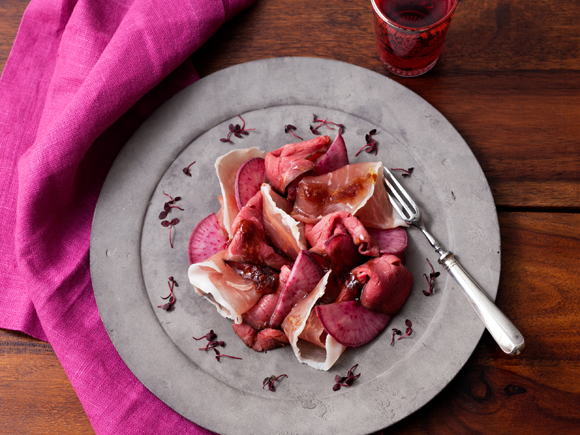 ローストビーフ、生ハム、紅大根、3つの“赤”を集めたワインに合うおつまみ。甘さ控えめのイチゴジャム、バルサミコ酢、オリーブオイルを混ぜてドレッシング・ソースをつくり、全体にかけます。仕上げに紅たでを散らして完成です。