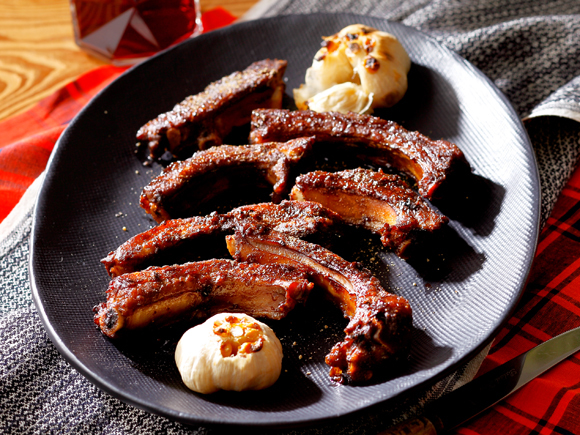 肉の味が濃いことで知られる豚のあばら肉を使った豪快な一品。赤ワイン・八丁味噌・バルサミコ酢などを合わせたタレにバックリブを一晩漬け、オーブンで焼きます。黒コショウ、山椒の粉をかけ、丸ごと焼いたニンニクを添えて完成です。