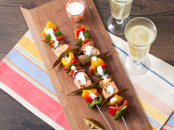見た目はワイルドだけど、食べる組み合わせで味も複雑になり満足感が倍増。サーモン、3色のパプリカ、みょうが、あんず、ローリエ、ライムを同じ大きさに切って串に刺し、味付けしてオーブンで焼きます。ヨーグルトソースをかけていただきます。