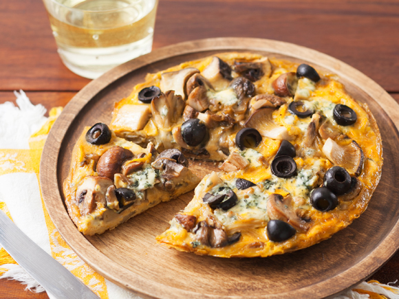 ブラウン&ホワイトマッシュルーム、エリンギ、えのき、まいたけなどコリコリ食感が楽しいきのこ、ブラックオリーブを炒め、卵と合わせてオムレツに。フライパンに流し込み、卵が半分固まったところでゴルゴンゾーラチーズを入れ、ふたをして蒸し焼きにします。